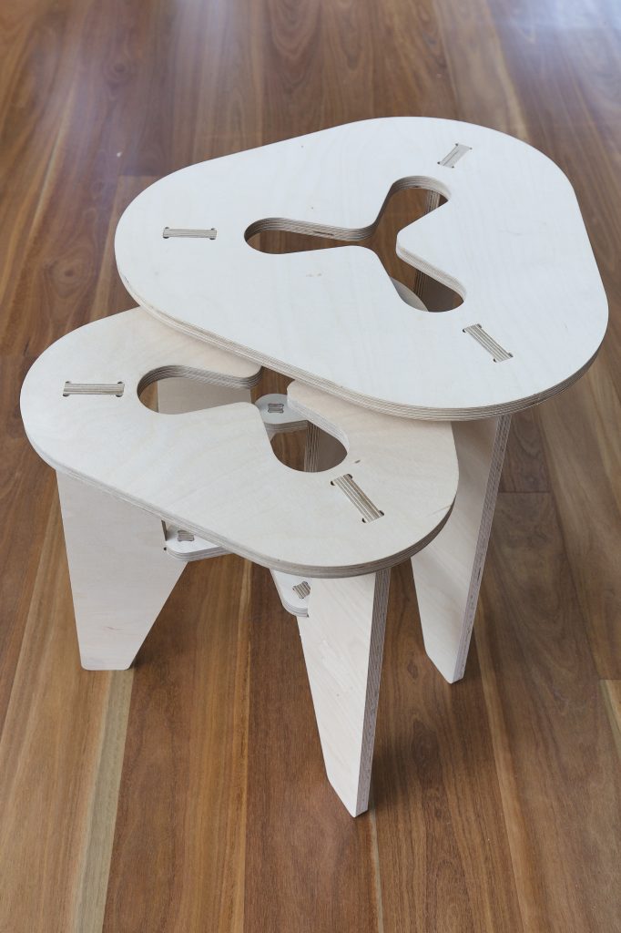 In this contemporary home for a young family of three, the Pear Chair and Plum Chair are used as seats around the dining table for when guests come to dine, seating in the hallway to take your shoes on and off, and as side tables in the bedroom.